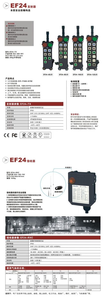 EF24系列是在F24系列基礎(chǔ)上研發(fā)的新一代防爆型遙控器,產(chǎn)品嚴格遵循防爆標準GB3638.1和GB3836.4并已經(jīng)通過了國家相關(guān)部門的EXiBII Bt4本質(zhì)安全型認證,可在環(huán)境惡劣的化工、礦山等可燃易爆的危險場合下安全工作。