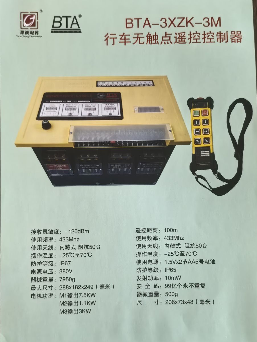 行車無觸點遙控控制器本產(chǎn)品主要用于工業(yè)行車,安裝便捷,具備智能相序保護、電動機斷相保護、防塵、配無線遙控器、地控接口、具有無線遙控器和地控自動 切換控制功能。